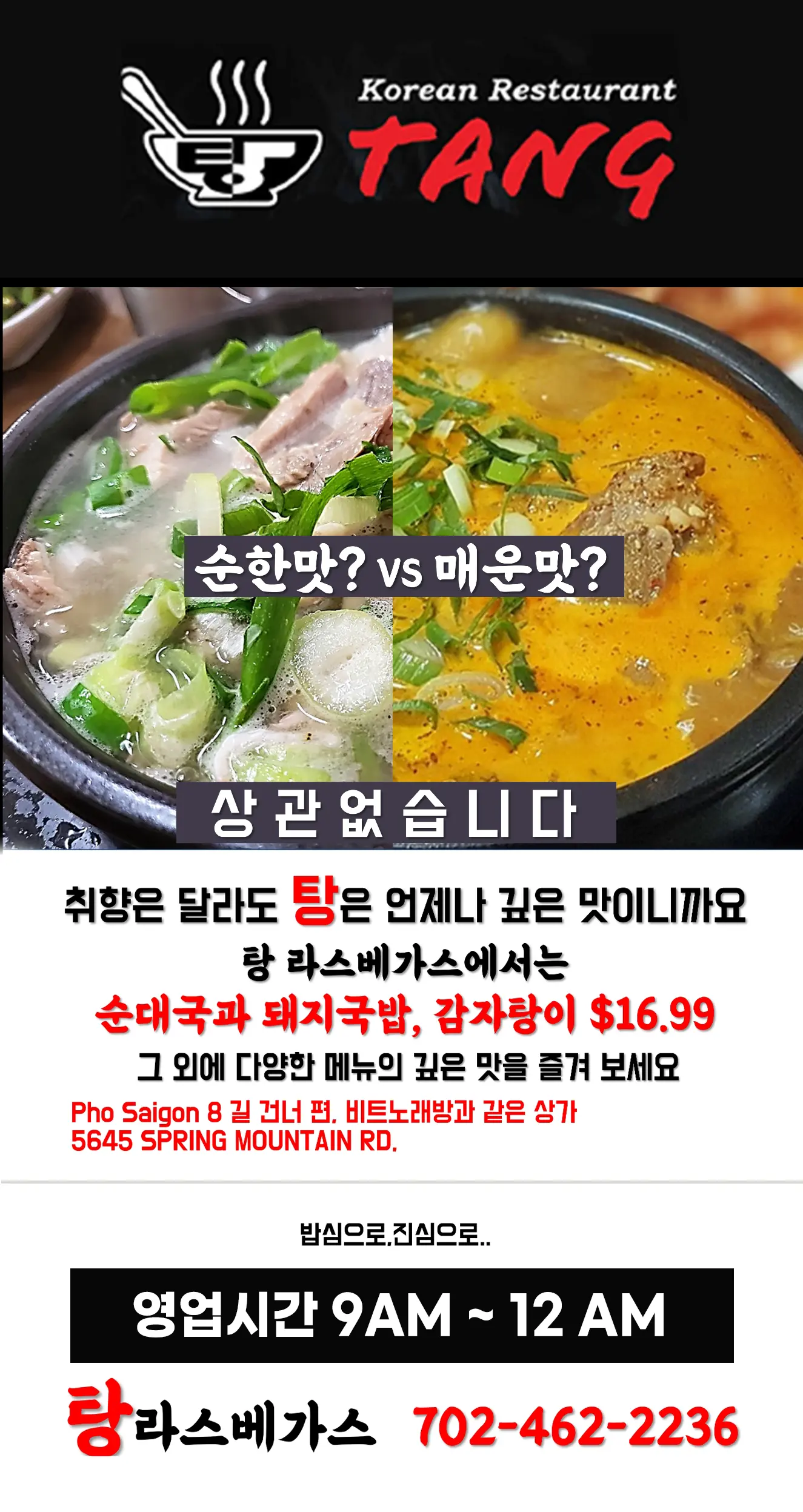 아침 9시부터 밤 12시까지 영업합니다!702-462-2236